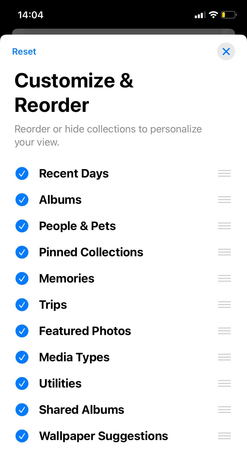 There, it is possible to reorder how the different photo features are displayed. For example, the aforementioned “Pinned Collections” can be dragged to the top so that “Recently Saved” photos are more prominent.