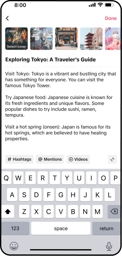 Beneath the title is where the post description lives which, TikTok explains, is the opportunity to “give viewers insight into the story you’re trying to tell to engage them quickly and get them to stick around until the end.”