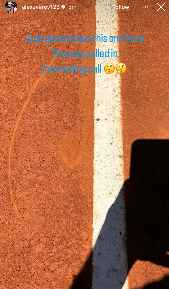 The umpire gave Zverev a warning for unsportsmanlike behavior for taking the photo of the mark. Not that the German player seemed to care all too much. When he shared the photo to Instagram he wrote: “Just gonna leave this one here. This was called in. Interesting call,” alongside two thinking emojis. The photo does show a ball mark not touching the line.