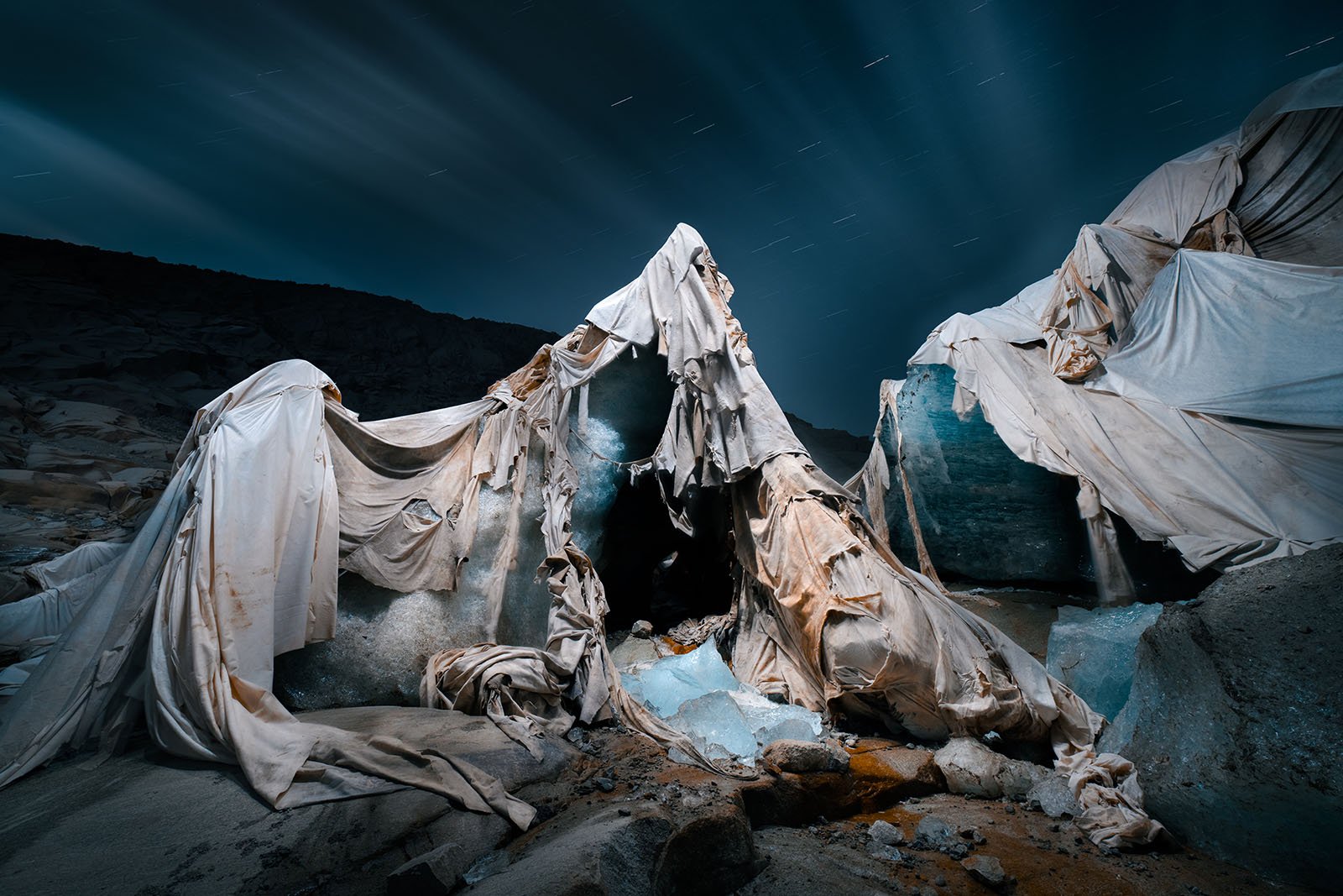 “Today, these coverings hang in tatters, like the torn skin of a dying giant”, Man explains. By anthropomorphizing the glacier, the photographer invites us to “bear witness to the cryosphere’s beauty and its vulnerability”.