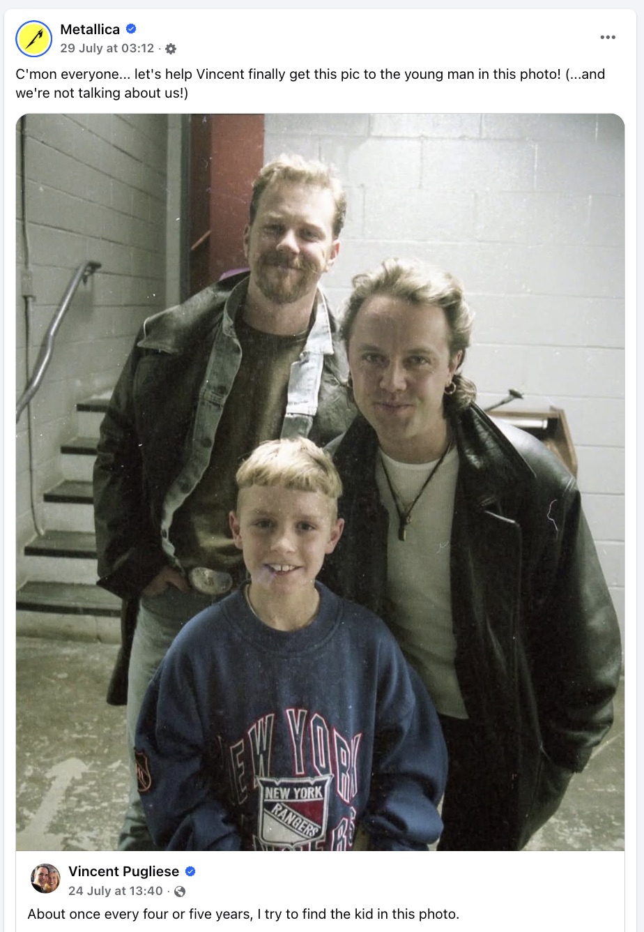 The official Metallica Facebook page — that is followed by 36 million people — had reposted Pugliese’s picture with the message, “C’mon everyone… let’s help Vincent finally get this pic to the young man in this photo! (…and we’re not talking about us!)”