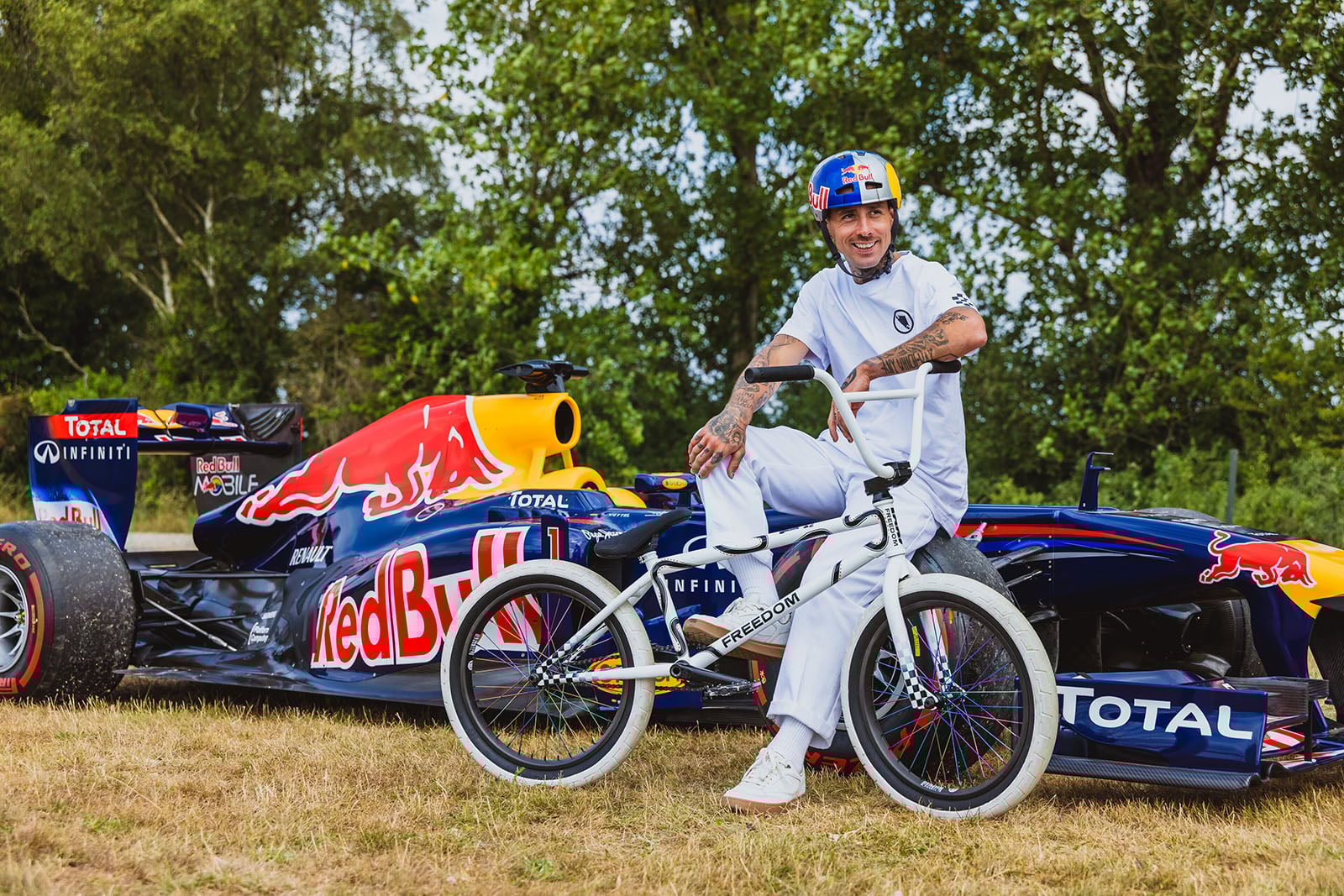 Kyle used a custom-built kicker that was designed by Red Bull Technologies so that he could jump the required 4.2 feet (1.3 meters) to safely clear the car. The F1 vehicle was driven by ex-F1 racing driver David Coulthard, but the stunt was still perilous thanks to the danger of landing on one of the razor-sharp wings attached to the Red Bull RB7 — Sebastian Vettel’s 2011 championship-winning machine.