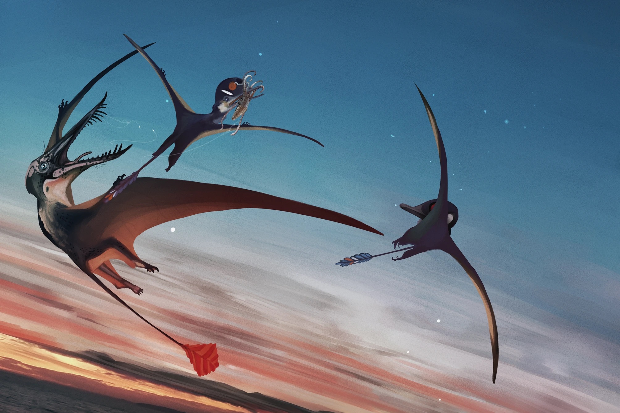 “Despite their differing cranial anatomies, teeth morphology, and wing shapes, these pterosaurs could interact and compete for food during periods of environmental stress. Set 170 million years ago in the Middle Jurassic, this image portrays these flying reptiles as they hunt along the shoreline.”