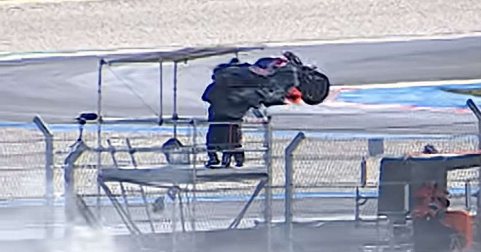 The cameraman, later identified as Joao, got extremely lucky as the out-of-control bike actually hit his camera as it somersaulted through the gravel trap and jumped up at the podium.
