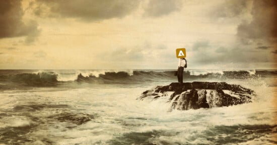 A person in business attire stands on a rocky outcrop surrounded by rough ocean waves under a cloudy sky. The person’s head is replaced by a yellow sign with a white upward arrow.