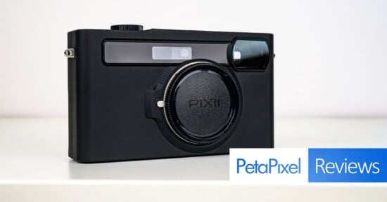 A black PIXII camera sits on a white surface, with the "PetaPixel Reviews" logo displayed in the bottom right corner of the image.